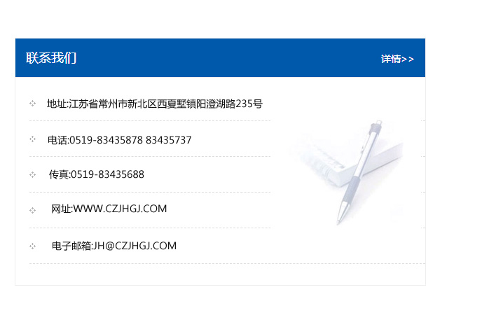 傳真:0519-83435688    郵編:213135    網址:WWW.czjhgj_com.sysjbz.com    電子郵箱:JH@czjhgj_com.sysjbz.com
